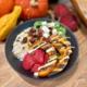 Mit Reis, Alb-Quinoa oder frischer Pasta, Salat der Saison, Edamame, gegrillte Süßkartoffel, Paprika, Gurke und schwarzer Sesam Dazu ein Dressing deiner Wahl (Sweet Chili, Joghurt, Sriracha-Mayo oder Erdnuss)