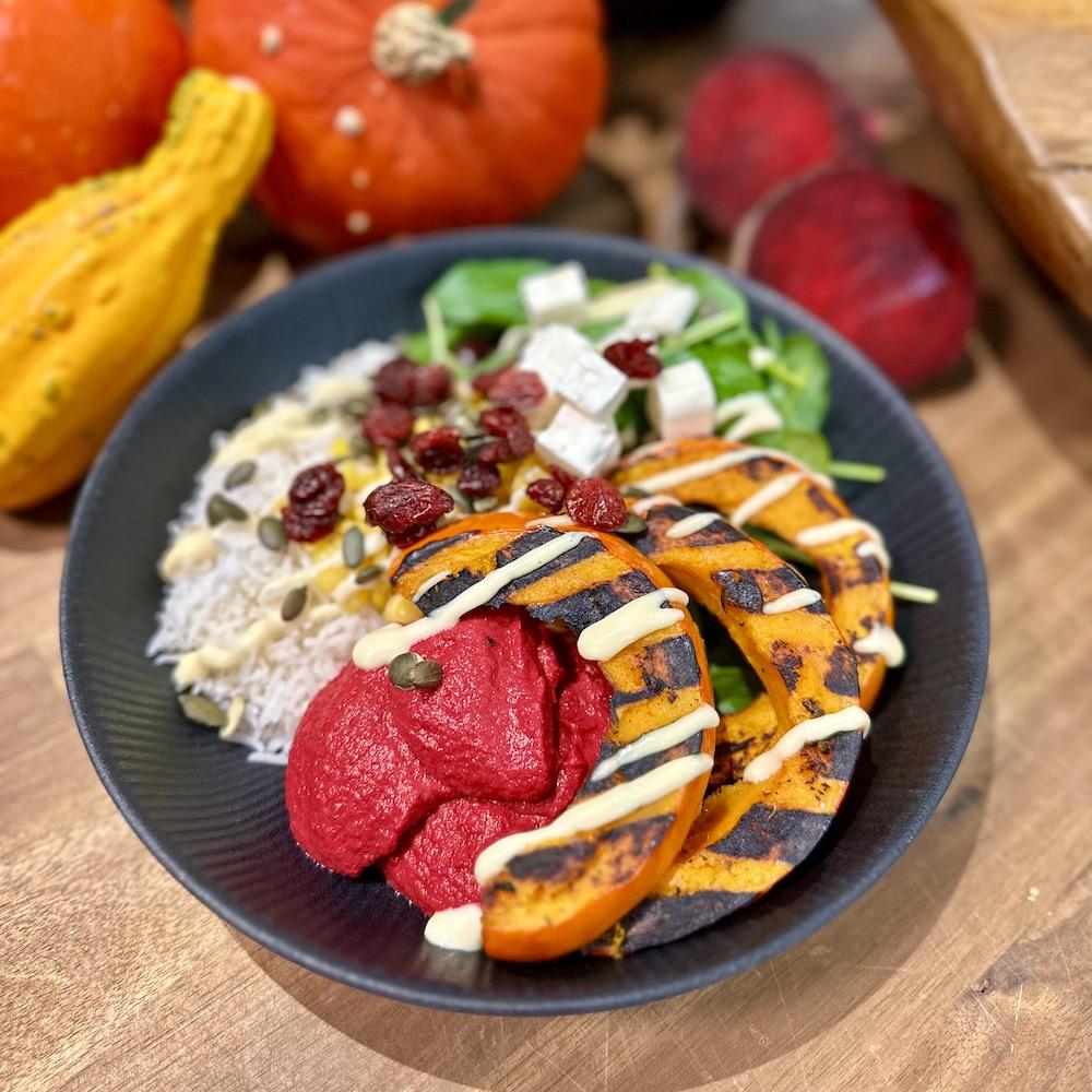 Ein goldener Herbstgruß auf deinem Teller 🍁 Mit cremigem Rote-Bete-Hummus, süßlich geröstetem Kürbis, würzigem Hirtenkäse & proteinreichen gelben Linsen. Dazu Honig-Senf-Dressing, Babyspinat, Cranberries & knusprige Kürbiskerne – alles auf warmem Reis.