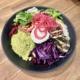 Reis, gegrillte Zucchini, Erbsenpüree, Rotkraut, gemischter Salat, Ziegenkäse Taler, süß-sauer eingelegte Zwiebeln, Erdnüsse mit Honig-Senf-Dressing.